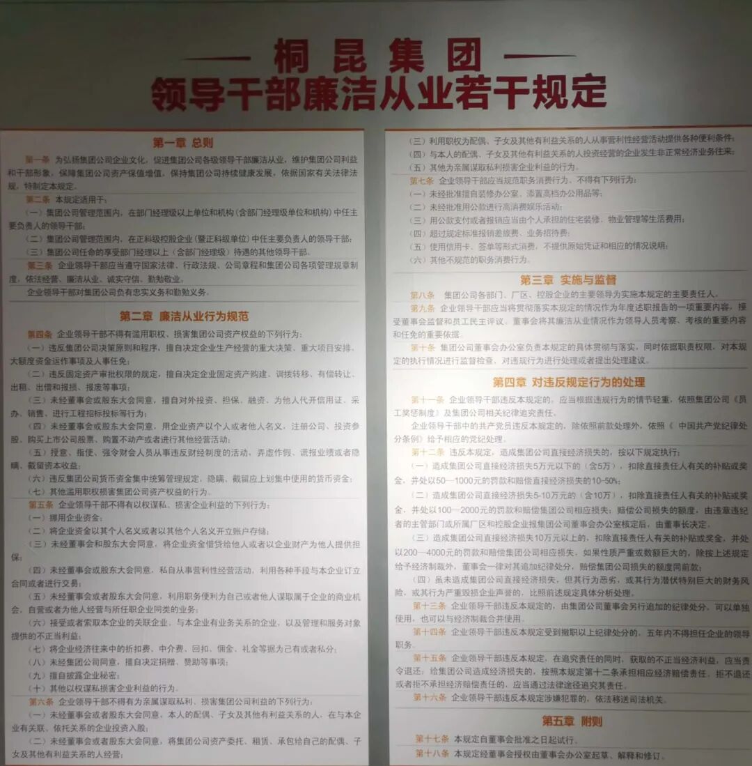 桐昆集团聚焦工程建设招投标、大宗物资采购、资金管理、财务管理、项目管理等重要领域,规范内控制度,建立《企业党风廉政建设制度》、《企业中层干部廉洁自律承诺制》、《企业诚信“十不”》等廉洁从业制度。围绕这些内控制度,集团对重点领域、关键环节开展严格的专项审计和监察审计,使生产经营各项环节不断改进。