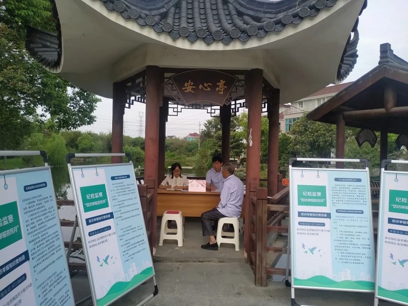 平湖市纪委市监委创新宣传方式,通过开展一次下访活动、发放一批宣传资料、开展一次业务培训等“五个一”活动对信访举报政策进行宣传。图为新埭镇纪检监察干部在廉政教育基地陆稼书尔安书院向监察联络站信息员宣传讲解信访举报知识。