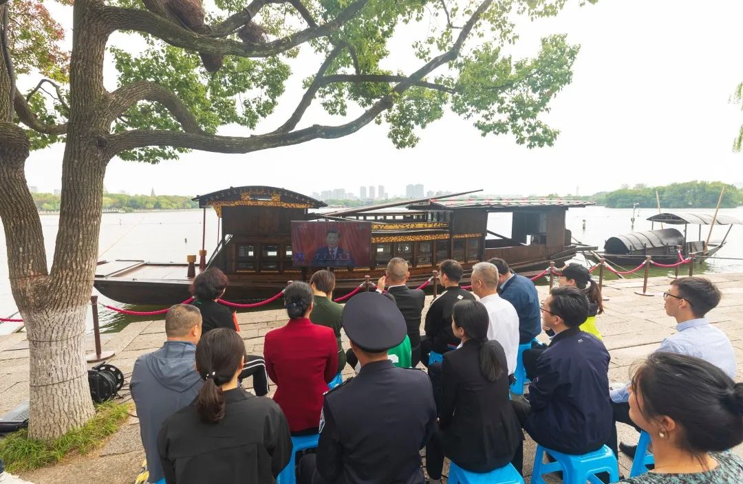 南湖区纪检监察干部在红船旁与群众一起收看党的二十大开幕的电视直播。
