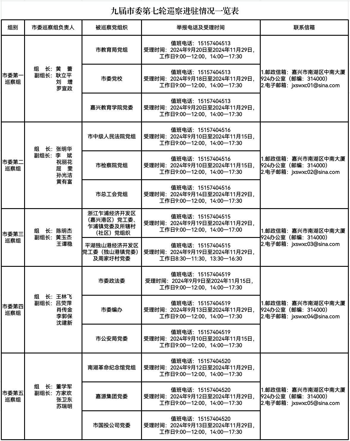 经市委批准,九届市委第七轮巡察将对市中级人民法院党组、市检察院党组、市委政法委、市委编办、市教育局党组、市公安局党委、市总工会党组、市委党校、嘉兴教育学院党委、南湖革命纪念馆党组、嘉源集团党委、市国投公司党委、浙江乍浦经济开发区(嘉兴港区)党工委、乍浦镇党委及所辖村(社区)党组织开展常规巡察,对平湖独山港经济开发区党工委(独山港镇党委)及周家圩村党委开展提级巡察,同时对政法领域开展巡视巡察上下联动。截至9月20日,5个市委巡察组全部完成进驻。