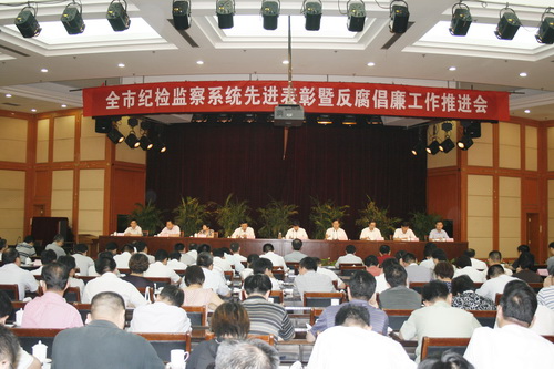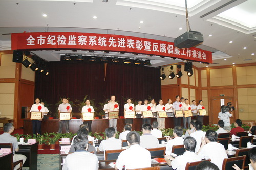 8月9日,全市纪检监察系统先进表彰暨反腐倡廉工作推进会在市行政中心多功能厅召开。会议认真学习了胡锦涛总书记“七一”重要讲话,深入贯彻落实省委十二届九次全会、市委六届十次全会精神,表彰全市纪检监察系统先进,回顾总结上半年全市党风廉政建设和反腐败工作,研究部署下半年各项任务。市委常委、市纪委书记徐鸣华出席会议并讲话。市纪委副书记、监察局局长姜锁楼主持会议。市人力资源和社会保障局党组书记、局长沈建华宣读表彰决定。