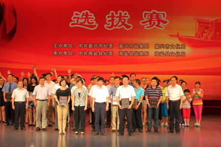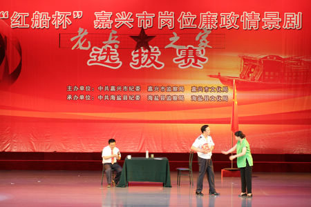 8月3日下午,由中共嘉兴市纪委、嘉兴市监察局、嘉兴市文化局主办,中共海盐县纪委、海盐县监察局、海盐县文化局承办的“红船杯”嘉兴市岗位廉政情景剧选拔赛在海盐大剧院隆重举行。在广大群众和各级组织推荐的基础上,经过脚本审定、节目初审等环节,最终确定了13个节目参加选拔赛。嘉兴市委常委、市纪委书记徐鸣华等领导亲临会场。