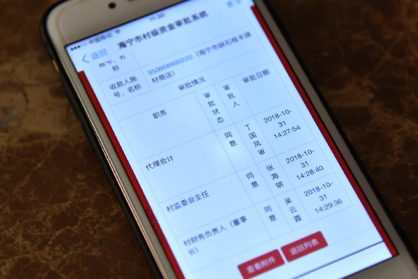 智慧监管的秘密,在于小小村务卡背后连着大系统——海宁市村级集体资金支付网上审批系统。通过该系统,每笔村级财务支出情况,包括发票、支出凭证、附带材料等,镇、村相关人员都可以随时在手机上查看支出情况,大大强化了财务的公开和支出的监督。另外,还可以通过手机APP随时随地审批,大大提高效率。今年10月运行以来,已成功完成45笔支付业务,涉及金额160余万元。