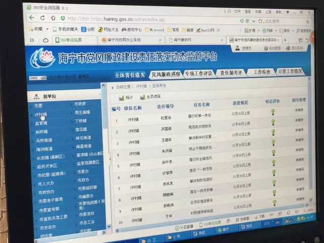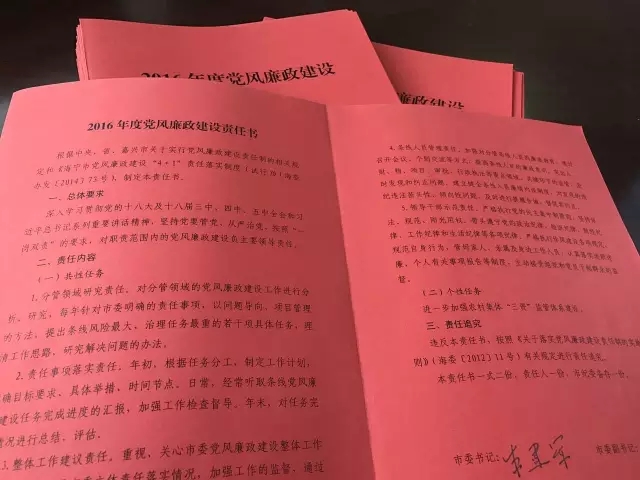 2017年1月16日,海宁市委书记朱建军带队对斜桥镇党风廉政建设情况进行检查考核,现场听取了镇党委书记党风廉政建设工作汇报,并随机点名分管领导询问其“一岗双责”落实情况。 图为海宁市委书记朱建军对斜桥镇党风廉政建设情况进行检查考核 这是海宁市纪委为抓住领导干部这个“关键少数”,构建起的“三单一网”中具体举措之一,目的就是要层层传导压力,压实主体责任。 所谓“三单”,指的是任务清单、考核清单和反馈清单。年初,建立任务清单,每位领导干部签订责任书,提出一项党风廉政建设个性化任务,作为年度主办担当项目。出台《海宁市党风廉政建设责任制考核实施细则》,列出考核清单,对主体责任落实进行刚性考核。年底,由市领导带队,对全市各单位党风廉政建设责任制落实情况进行检查考核,并一一列出反馈清单进行“一表式”反馈。 图为海宁市委书记与领导干部签订的党风廉政建设责任书 如果说“三单”是集中在一些时间点上开展监督,那么“一网”则是把监督落实到日常。借助科技手段,海宁市建立了“党风廉政建设责任落实动态监管平台”,将全市领导干部个性任务项目纳入网上平台进行管理,各级纪检组织分季度分色评定,实时跟踪监督。 图为海宁市党风廉政建设责任落实动态监管平台 2016年,全市领导干部共领衔个性化任务556项,组织市纪委委员面对面听取12个镇(街道)和5个重点部门(单位)落实主体责任工作报告,反馈问题73个,提出意见建议32条,运用动态监管平台定期评价监督2100余次,亮出黄灯26次,督促556项个性化任务全部完成。 2016年6月,某局下属单位负责人因严重违纪被开除党籍、开除公职,同月,因犯滥用职权罪、受贿罪,被判处有期徒刑三年三个月,并处罚金十万元。对此,海宁市纪委实行“一案双查”,最终分管该下属单位的副局长因履职不力受到党内警告处分。 图为海宁市印发的《海宁市党风廉政建设“一案双查”暂行办法》 动员千遍,不如问责一次。海宁市纪委始终坚持以强有力的问责推动主体责任落实,认真执行《海宁市党风廉政建设“一案双查”暂行办法》。2016年,海宁市共对5名履行党风廉政建设主体责任不力的单位负责人进行责任追究,以问责倒逼党员干部担当。 通报曝光——问责一个 警醒一片 2016年12月30日,海宁市纪委官方网站、微信同步发布了“海宁市通报曝光5起违反中央八项规定精神和基层侵害群众利益的问题”,问责案例一经曝光,就引起了党员干部的关注。 图为“廉洁海宁”微信公众号通报曝光本地问责案例 为使问责的威慑力发挥出最大效用,让更多的党员干部从中吸取教训,海宁市纪委运用网站、微信曝光台,点名道姓通报曝光典型案例,共对8起违反中央八项规定精神和基层侵害群众利益典型案例进行了通报曝光,营造起了执纪从严的氛围。 运用典型案例开展警示教育。2016年7月11日,海宁市召开警示教育大会,市委书记对全市600多名领导干部进行以案说纪式的谈话,讲话中一个个发生在党员干部身边的案例成为现场最生动的教材,形成了面上的震慑。 图为海宁市召开全市领导干部警示教育大会 此外,海宁市纪委还深入剖析典型案例,制作《学习与警示》教育资料发送给全市党员干部,以案例情景模拟形式进行廉政微测试,对农经局腐败窝案及“一案双查”问责案件进行了深入剖析,并制作成专题片《涉农补贴“补贴”了谁》。在海宁,“一案一剖析、一案一通报、一案一教育”的工作机制不断完善,“不敢腐”的氛围已经形成。