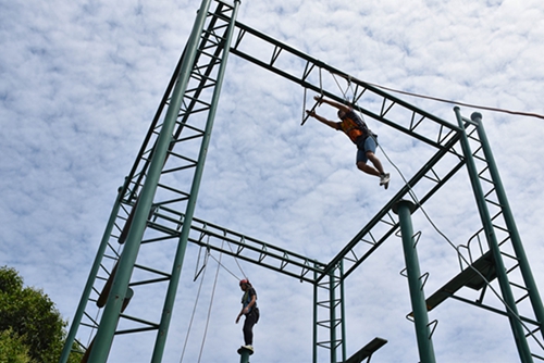 空中单杠有一定的挑战性。市纪委副书记、市监委副主任王蕾作为女子队员,第一个参加挑战,并顺利完成任务,赢得大家热烈掌声,给青年队员做出了示范。一些青年干部在队友们的鼓励下,克服内心的恐惧,勇敢地攀爬上8米高铁杆,站立在顶端,然后腾空跳起,抓住前方的单杠。在攀爬、站立遇到困难时,队友们都齐声加油鼓劲,并认真做好安全防护工作,协助完成挑战。