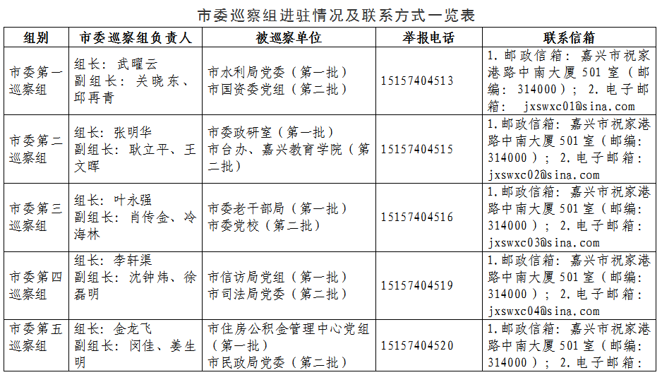 根据嘉兴市委巡察工作领导小组统一部署,近日,嘉兴市委巡察组对2019年度市委第一轮巡察第一批5家单位进行集中进驻,在被巡察单位召开巡察工作动员会,传达市委书记专题会议精神,公布本轮巡察任务安排和工作要求。目前,各巡察组正在开展驻点巡察工作。第一批单位结束后,将适时进驻第二批单位单位开展巡察。