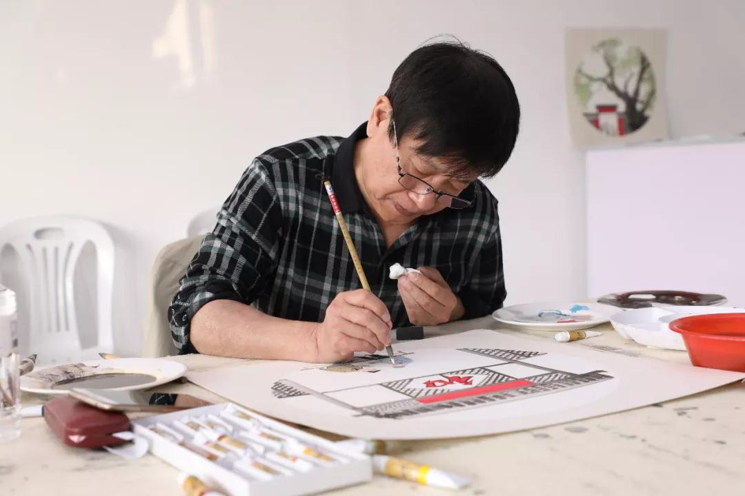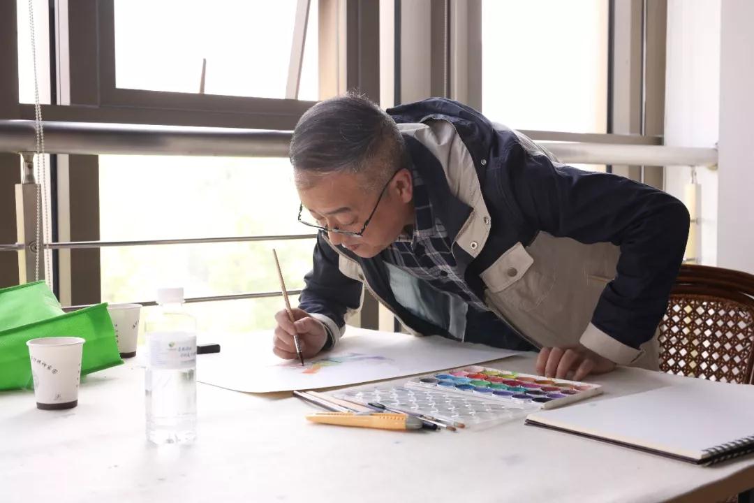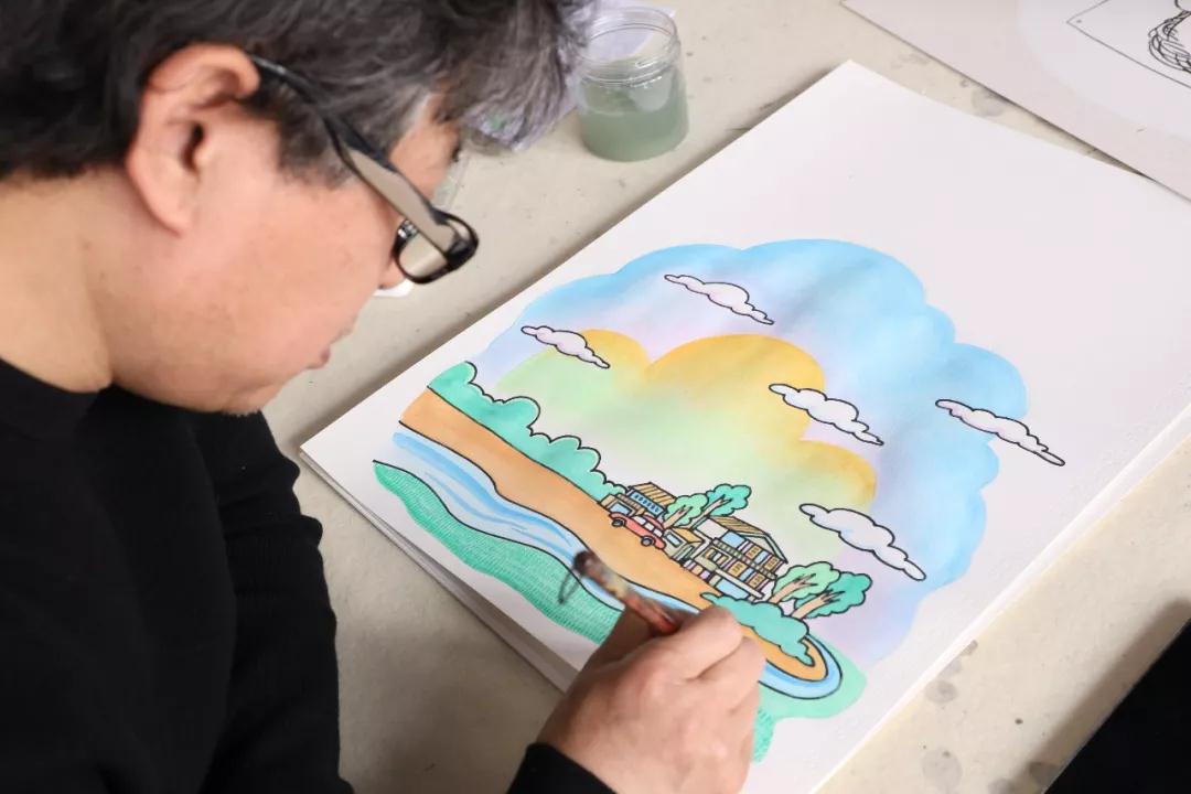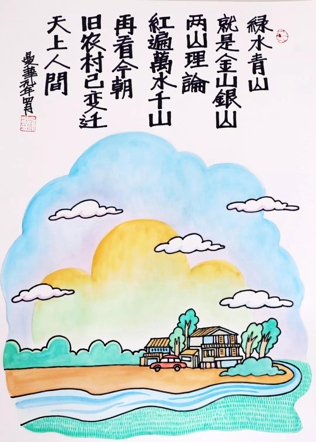 “这次我创作的作品中把青山画成了金元宝的样子。因为余村以前只有一个矿,污染非常严重,后来他们把矿关掉了。余村的村民开始保护环境,用他们勤劳的双手实现了‘绿水青山就是金山银山’。我感受特别深,所以我就作了这么一幅画。我采风的时候拍了当地农民住的小洋楼,给我老婆发了过去,我老婆就给我回了一条——我想在这里安个家。”