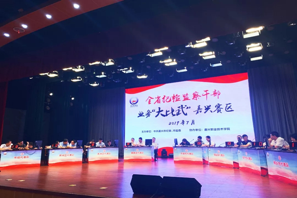 7月24日下午,全省纪检监察干部业务“大比武”嘉兴赛区比赛在嘉兴职业技术学院报告厅举行。来自全市纪检监察系统的八个代表队、24名选手同场竞技。嘉兴市委常委、市纪委书记、市监委主任张建明出席活动,全市300余名纪检监察干部代表现场观摩比赛。