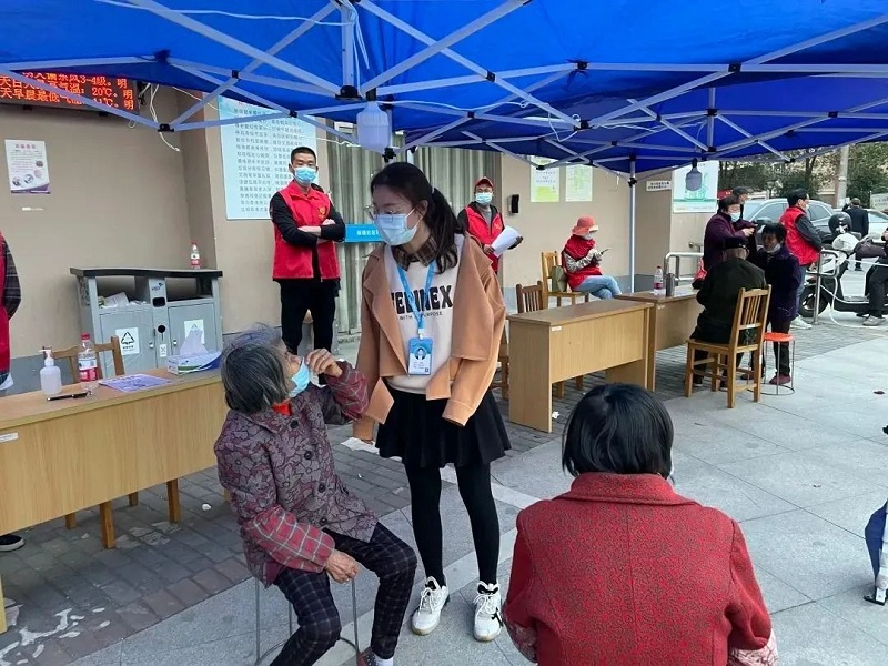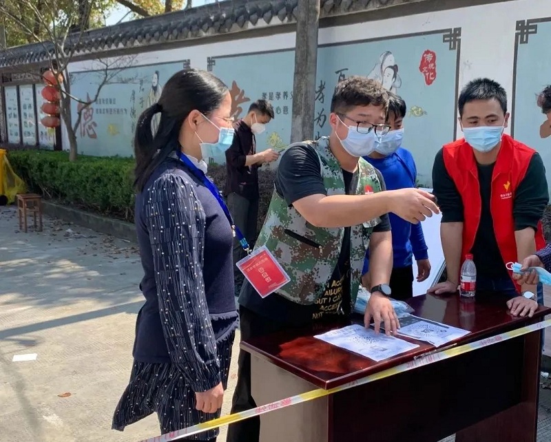 顾彦是海盐经济开发区(西塘桥街道)的一名纪工委委员。婚期将至的她本打算请假筹备婚礼,但面对突如其来的疫情,她冲锋在前。3月14日一清早,作为区内常住人口最多的社区——新港社区联村干部中的一员, 她帮助临时核酸检测点搭建帐篷、放置桌椅、接送医护人员,确保核酸检测顺利进行。“在这个共抗时艰的关键时刻,为保障群众的生命安全贡献一份力量,我责无旁贷。”顾彦说道。