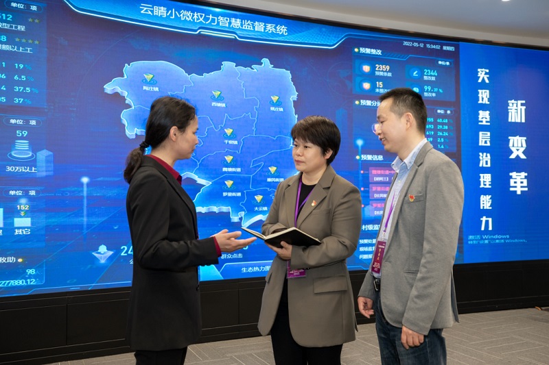 嘉善县纪委县监委参与开发基层公权力大数据监督应用(“云睛”系统),通过大数据智能分析和信息公开,加强对村级采购、工程项目、资产处置等村级小微权力运行情况的监督。图为工作人员对“云睛”系统的数据信息进行分析。嘉善县纪委县监委 季俊杰 摄