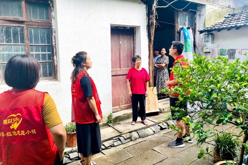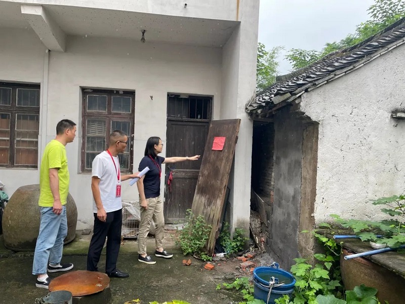 南湖区纪委区监委成立11个专项监督组奔赴一线,围绕防汛防台工作开展情况进行督查,全力保障人民的生命财产安全。图为督查组赴大桥镇建国村查看地势低洼处危房的人员转移情况。