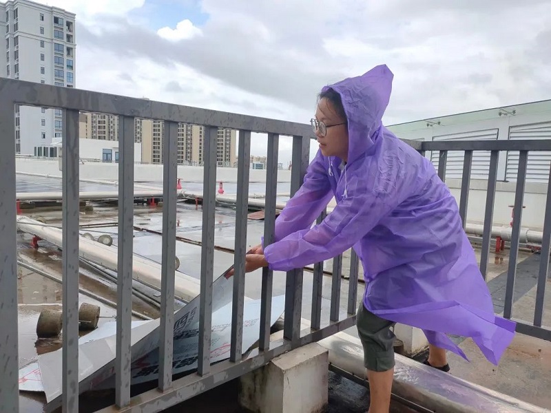 平湖市各级纪检监察干部立足监督首责,主动担当作为,积极投身防风抗台一线,确保人民群众生命财产安全。图为该市纪检监察干部在房顶细致排查安全隐患,督促及时整改到位。