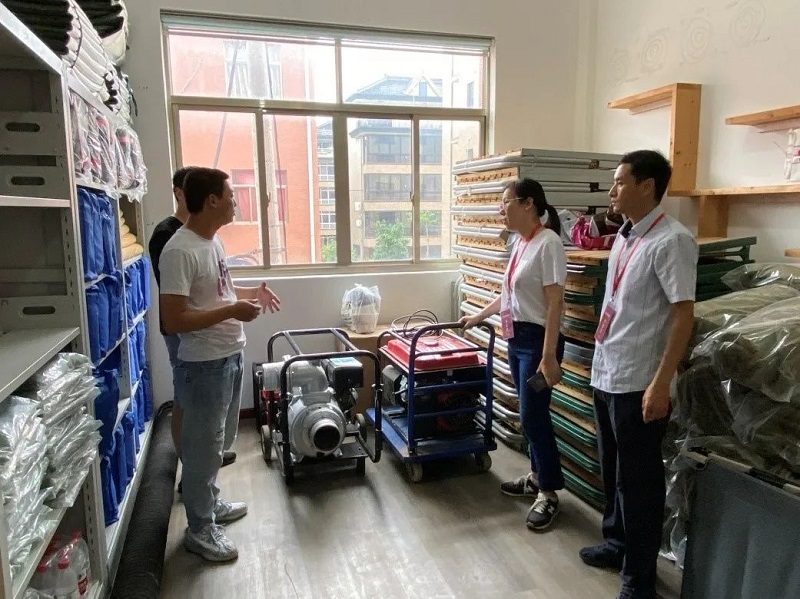 嘉善县大云镇纪检监察干部协同大云村工作人员对该村河道、新建小区建筑工地、危旧房等重点区域及避灾安置场所等重要点位开展防汛防台隐患排查。图为该镇纪检监察干部对该村防汛抗台相关物资准备情况进行检查,并对发现的问题督促整改。