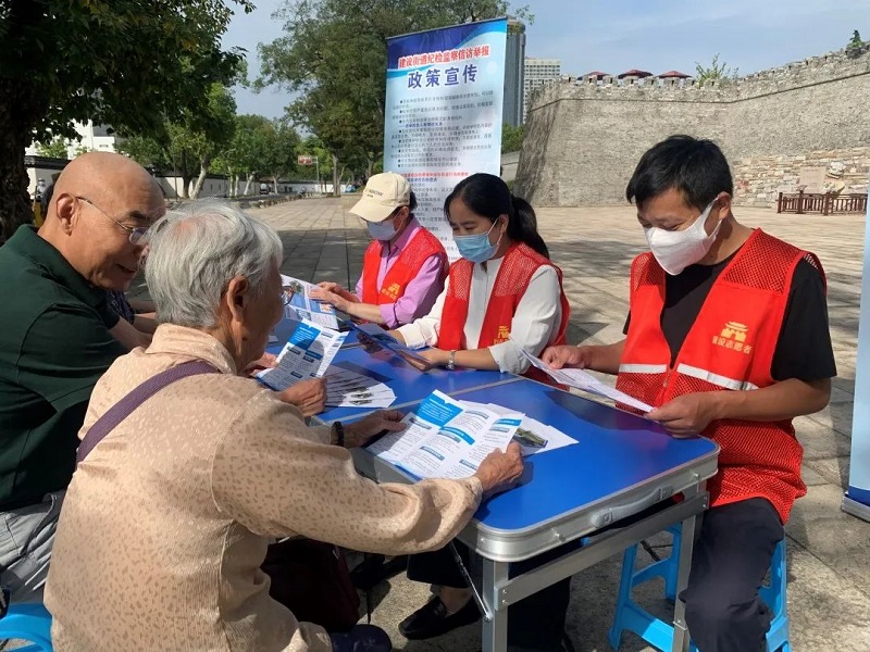 南湖区纪委区监委采取“线上+线下”相结合的方式,区、镇、村三级联动,通过设点宣传、制作海报、发放宣传资料、微信和读嘉推送等方式,深入村(社)广场、核酸检测点、文化礼堂等开展信访举报政策宣传。图为建设街道纪工委干部在子城遗址广场开展政策宣传。