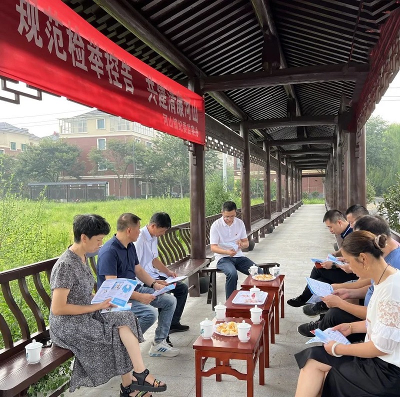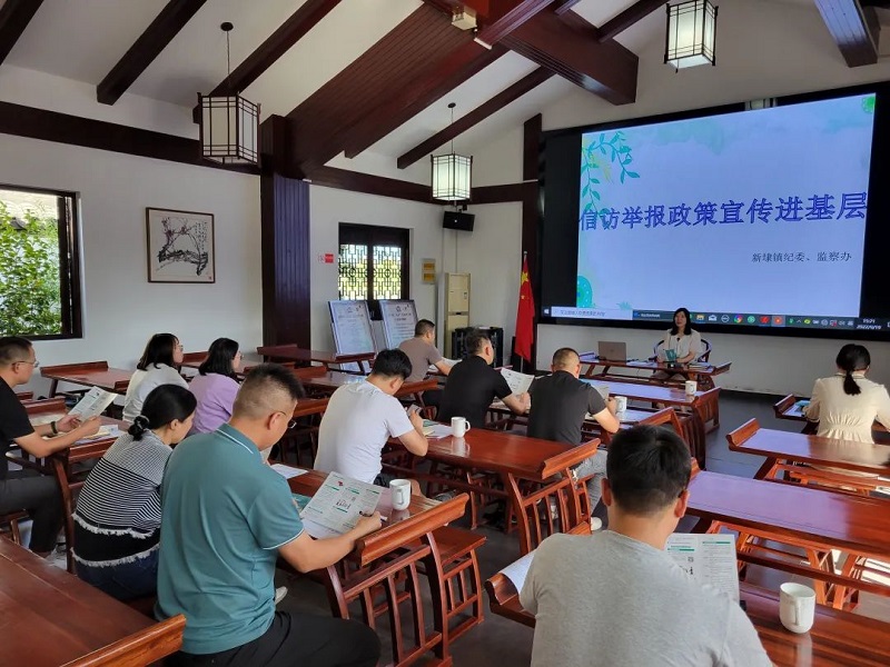 平湖市纪委市监委创新宣传方式,通过开展一次下访活动、发放一批宣传资料、开展一次业务培训等“五个一”活动对信访举报政策进行宣传。图为新埭镇纪检监察干部在廉政教育基地陆稼书尔安书院向监察联络站信息员宣传讲解信访举报知识。