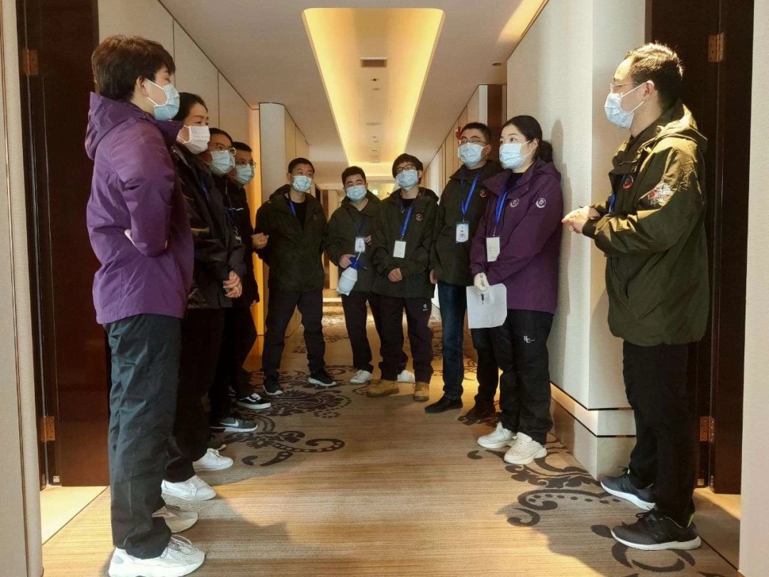 为确保集中隔离点安全有序、严密有效,钱晓唯带领志愿者制定隔离人员进出管理办法和消杀流程。图为钱晓唯(右一)在集中隔离点召集志愿者开展模拟演练。朱清 摄
