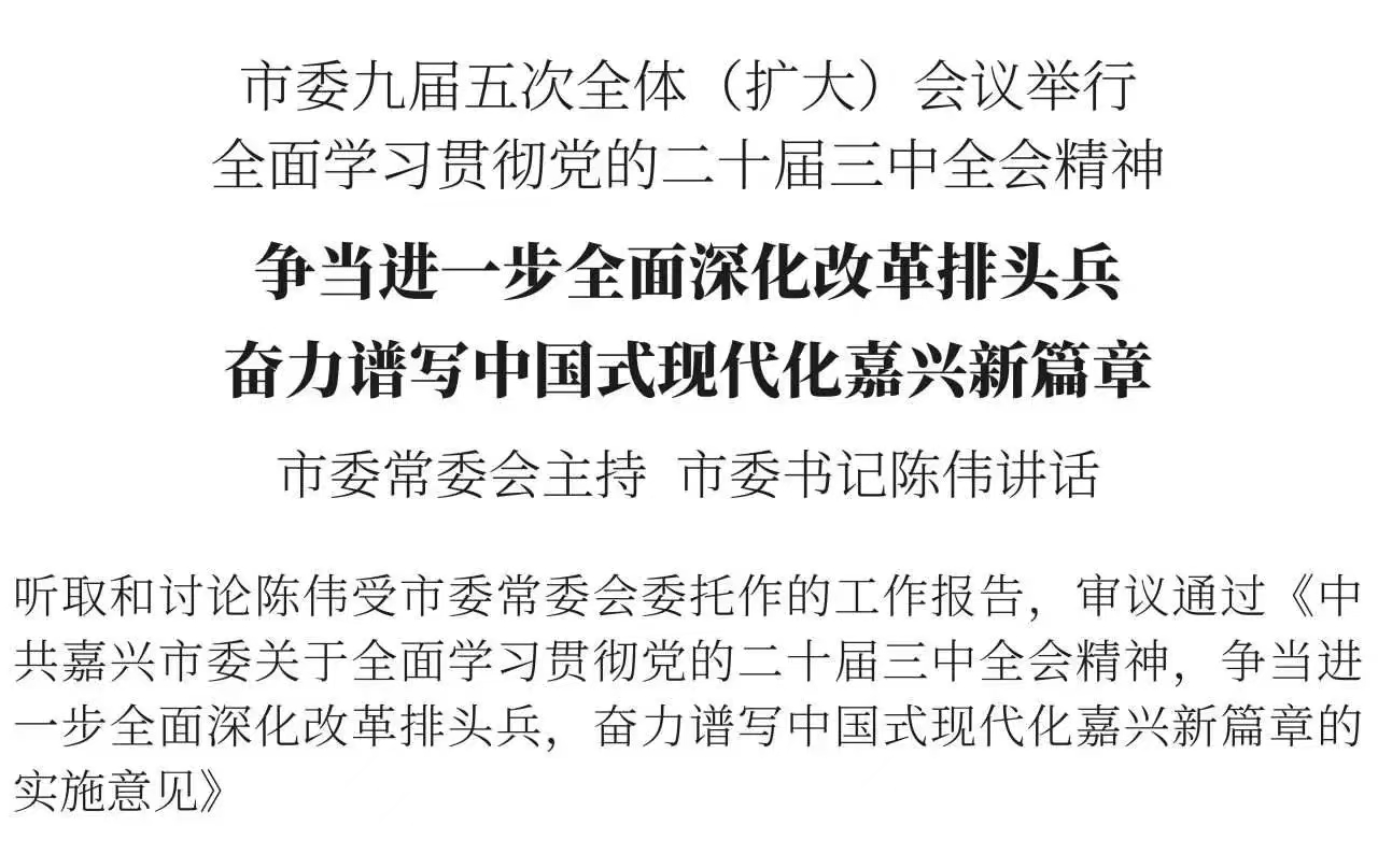 全会坚持以习近平新时代中国特色社会主义思想为指导,全面学习贯彻党的二十届三中全会精神,深入贯彻落实习近平总书记关于全面深化改革的一系列新思想、新观点、新论断和考察浙江重要讲话精神,认真落实省委十五届五次全会精神,审议通过《中共嘉兴市委关于全面学习贯彻党的二十届三中全会精神,争当进一步全面深化改革排头兵,奋力谱写中国式现代化嘉兴新篇章的实施意见》,研究部署当前和今后一个时期改革工作,为在全省勇当先行者谱写新篇章中勇挑大梁勇立潮头提供强大动力和制度保障。会议结束时,陈伟就贯彻落实全会精神、做好当前工作作了讲话。