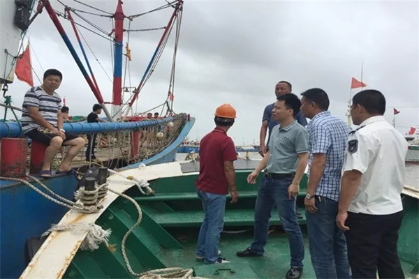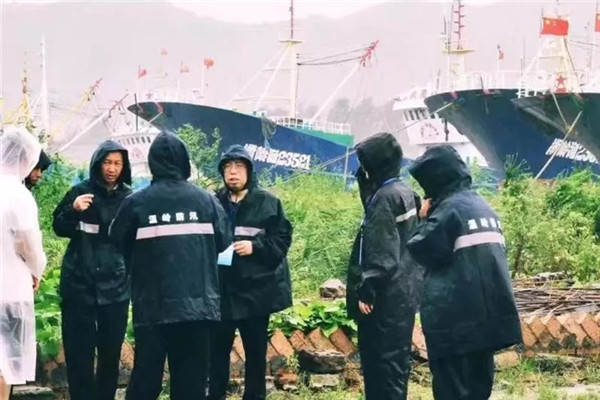 嵊泗县嵊山镇纪委监察办党员干部在县中心渔港对渔船抛泊安全进行巡逻检查,及时排查渔船避风安全隐患,面对面交谈抗台注意事项。