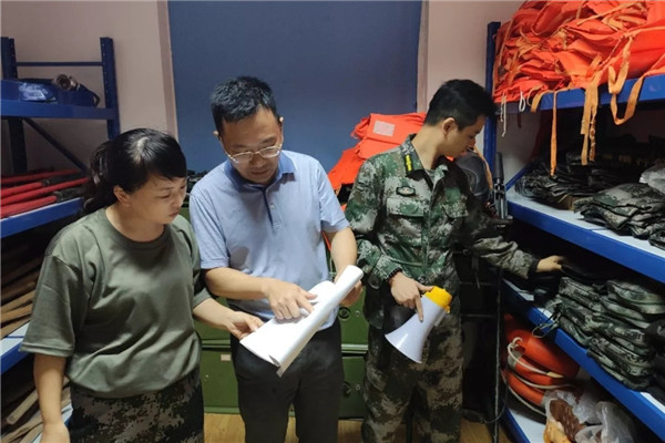 北仑区新碶街道纪工委党员干部检查防汛物资准备情况。