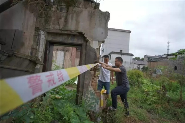 长兴县水口乡纪委监察办党员干部排查辖区内危旧房状况,协助村民转移。