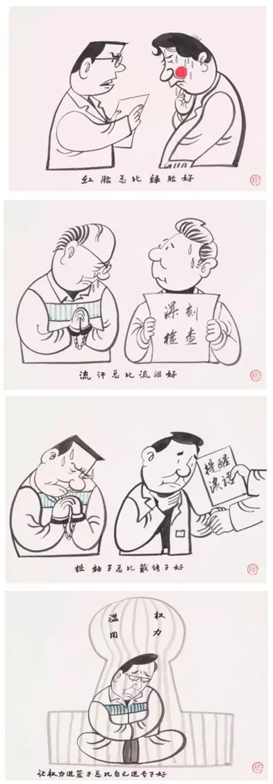 漫画用简洁的笔调形象地体现了“四种形态”的有关内涵,阐述了抓早抓小的重要性,宣传了“惩前毖后、治病救人”方针。