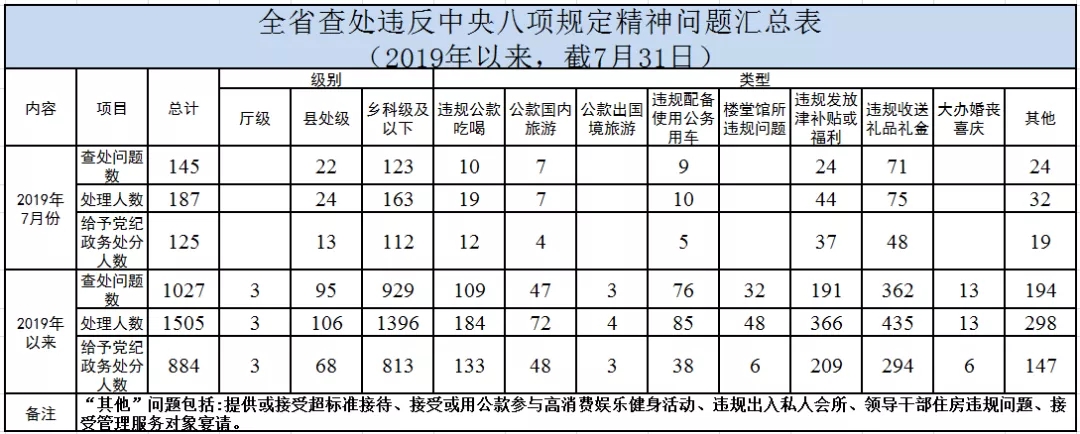 2019年7月,全省各级纪检监察机关共查处违反中央八项规定精神问题145起,处理187人,给予党纪政务处分125人,其中: