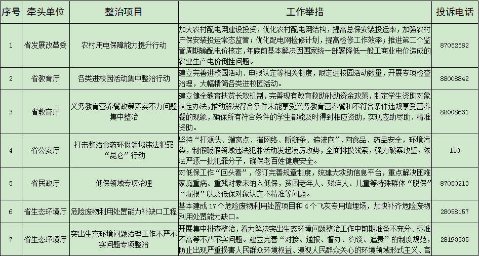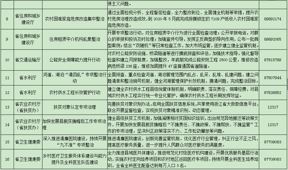 为深入推进“不忘初心、牢记使命”主题教育,真刀真枪解决实际问题,不断保障和改善民生,根据省委主题教育领导小组《关于在“不忘初心、牢记使命”主题教育中开展专项整治工作的通知》,省纪委省监委机关牵头,省发展改革委、省教育厅、省公安厅、省民政厅、省生态环境厅、省住房和城乡建设厅、省交通运输厅、省水利厅、省农业农村厅(省扶贫办)、省卫生健康委、省医疗保障局、省市场监管局、省统计局、省通信管理局等职能部门结合工作实际,聚焦解决群众身边的操心事、烦心事、揪心事,组织开展了“扶贫、民生领域不正之风和侵害群众利益问题专项整治”。现将集中开展的23个整治项目向社会公开,接受广大群众监督。
