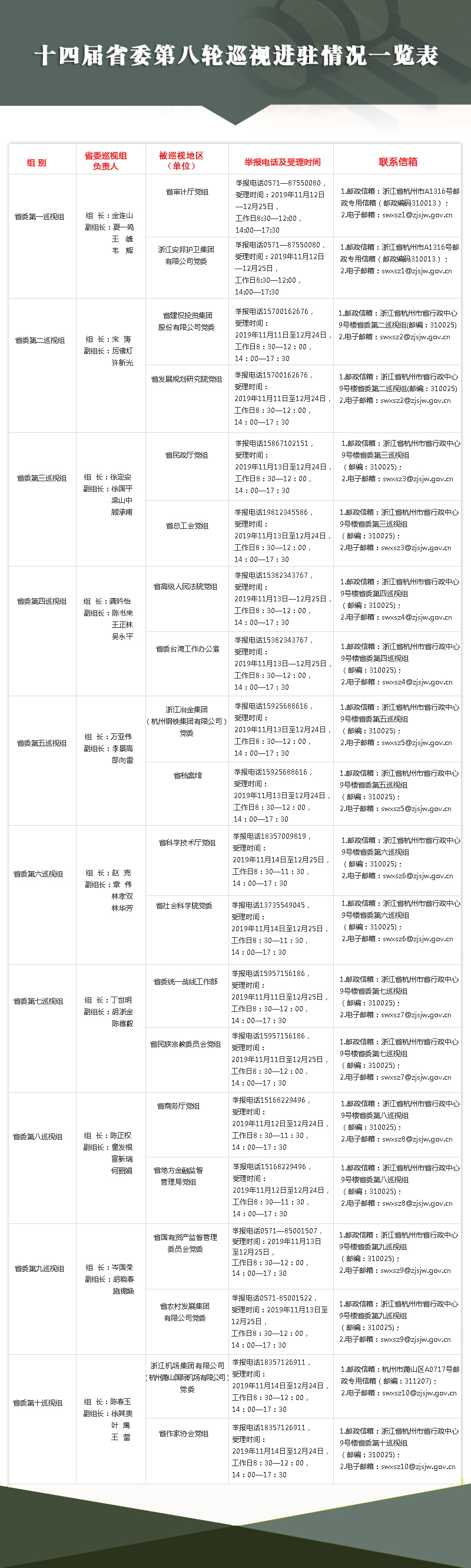 经省委批准,十四届省委第八轮巡视将对省委统战部(省政府侨务办公室)、省委台湾工作办公室(省政府台湾事务办公室)、省档案馆、省科学技术厅党组、省民族宗教事务委员会党组、省民政厅党组、省商务厅党组、省审计厅党组、省政府国有资产监督管理委员会党委、省地方金融监督管理局(省政府金融工作办公室)党组、省社会科学院党委、省发展规划研究院党组、省高级人民法院党组、省总工会党组、省作家协会党组、省建设投资集团股份有限公司党委、浙江冶金集团(杭州钢铁集团有限公司)党委、省农村发展集团有限公司党委、浙江省机场集团有限公司(杭州萧山国际机场有限公司)党委、浙江安邦护卫集团有限公司党委等20个单位党组织开展常规巡视。截至目前,10个省委巡视组全部进驻上述单位并召开动员会。