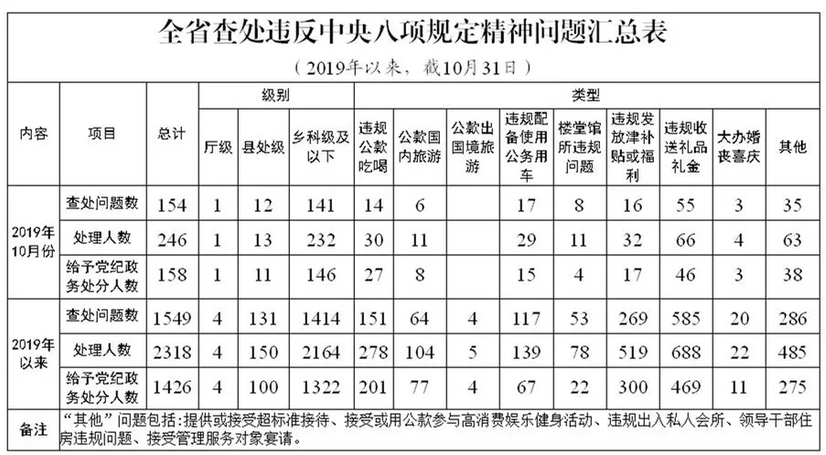 2019年10月,全省各级纪检监察机关共查处违反中央八项规定精神问题154起,处理246人,给予党纪政务处分158人,其中,违规收送礼品礼金问题55起,违规配备使用公务用车17起,违规发放津补贴或福利问题16起,违规公款吃喝14起,这4类问题占查处问题总数的66.2%。从受党纪政务处分人数看,厅级1人,县处级11人,乡科级及以下146人,其中乡科级及以下占92.4%。