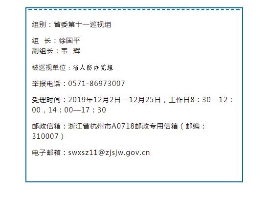 按照省委有关巡视工作的部署要求,省委第十一巡视组将坚持以习近平新时代中国特色社会主义思想为指导,认真履行党章和巡视工作条例赋予的职责,牢牢把握政治巡视的根本定位,紧扣“两个维护”根本任务,突出“机动式”巡视“短平快”特点,聚焦巡视整改工作,深入检查省人防办党组履行主体责任情况、派驻机构履行监督责任情况和其他违纪违法问题。巡视期间,巡视组主要受理反映省人防办党组领导班子及其成员、下一级党组织领导班子主要负责人和重要岗位领导干部问题的来信来电来访。受理信访时间以巡视公告为准。