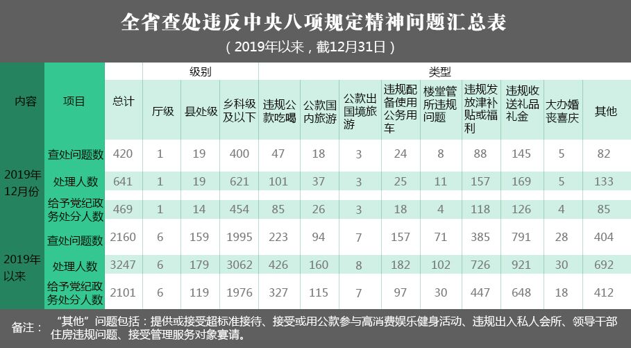 2019年12月,全省各级纪检监察机关共查处违反中央八项规定精神问题420起,处理641人,给予党纪政务处分469人,其中,违规收送礼品礼金问题145起,违规发放津补贴或福利问题88起,违规公款吃喝47起,违规配备使用公务用车24起,这4类问题占查处问题总数的72.4%。从受党纪政务处分人数看,厅级1人,县处级14人,乡科级及以下454人,其中乡科级及以下占96.8%。
