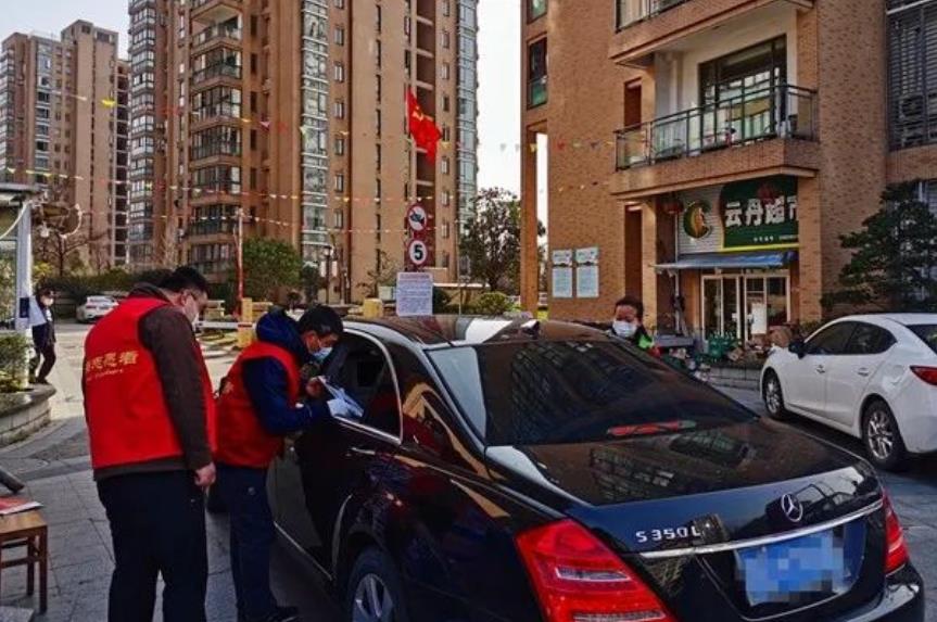 党员干部在宁海县桃源街道海锦苑社区有序检查放行车辆和人员
