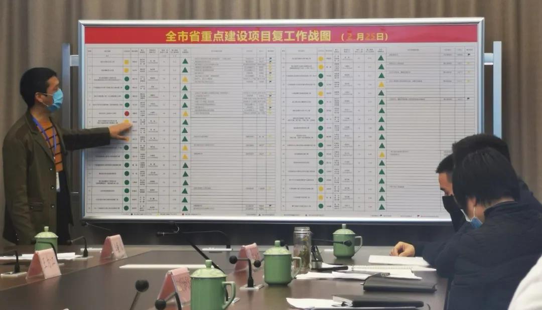 2月25日下午,督导组召集丽水市水利、自然资源等部门参加的专题会,对推进重点工程复工复产做进一步协调。会议现场,一张标识着丽水市所有省级重点工程的“三色图”引来阵阵讨论。在督导组指导下,丽水市将重大项目按复工复产率,标为绿、黄、红分级管理。“如果工程被标为红色,我们将进一步督导,帮助尽快复工复产。”督导组成员表示,截至2月26日,丽水市省级重点工程人员到岗率达76.8%,复工率达100%。