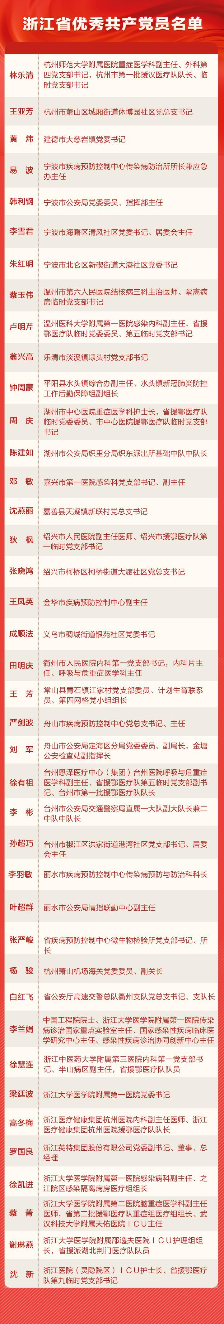 新冠肺炎疫情发生以来,全省广大党员、干部坚持以习近平新时代中国特色社会主义思想为指导,认真学习贯彻习近平总书记关于疫情防控工作的重要讲话和指示批示精神,按照党中央和省委决策部署,冲锋在前、英勇奋战,充分发挥先锋模范作用,让党旗在疫情防控斗争第一线高高飘扬,为疫情防控工作取得阶段性重大成果作出了积极贡献,涌现了一大批先进典型。为表彰先进,激励全省广大党员、干部再接再厉、善作善成,在大战中践行初心使命、在大考中交出合格答卷,省委决定,授予在疫情防控斗争第一线表现突出的林乐清等40名同志“浙江省优秀共产党员”称号。