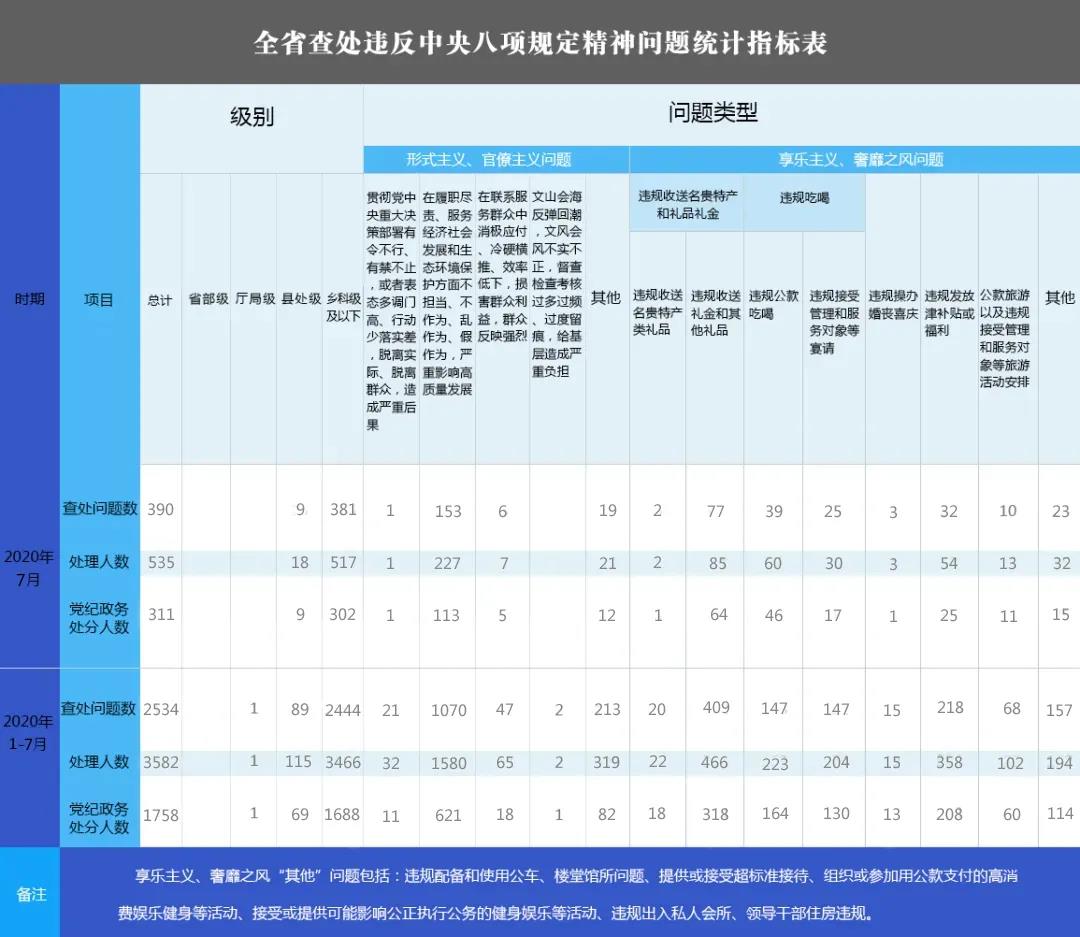 2020年7月,全省各级纪检监察机关共查处违反中央八项规定精神问题390起,处理535人,给予党纪政务处分311人。