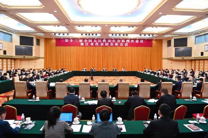 5日下午,浙江代表团在驻地举行全体会议,审议李克强总理代表国务院所作的政府工作报告。记者 胡元勇 摄