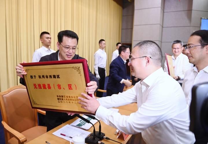 省领导为获得2020年度美丽浙江建设(生态文明示范创建行动计划)工作考核优秀的市、县(市、区)代表,获得2020年度“五水共治”(河长制)工作“大禹鼎”的优秀市、县(市、区)代表,省第四批“无违建县(市、区)”代表授奖牌、授鼎。记者 胡元勇 摄