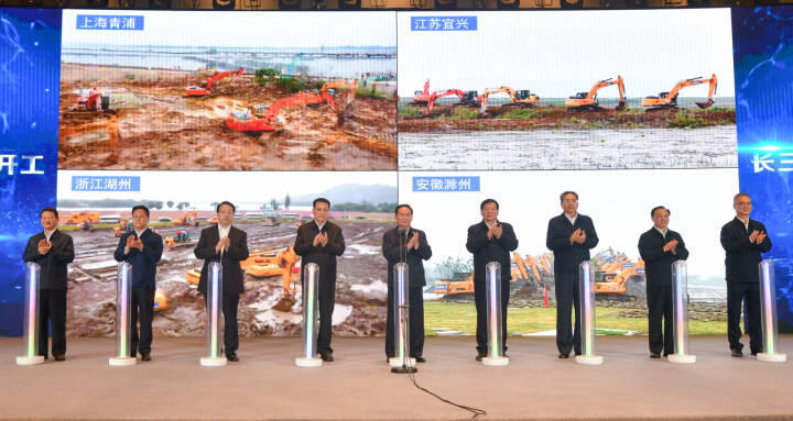 这次重大项目集中开工是今年长三角地区主要领导座谈会的重要内容,活动主会场设在无锡,三省一市在项目建设现场设立分会场。上海、江苏、浙江、安徽的项目建设现场,大型工程机械云集,一派热火朝天景象。主会场与建设现场视频连线,听取三省一市政府分管负责同志关于开工项目情况汇报后,三省一市主要领导同志和国家发展改革委有关负责同志共同启动项目集中开工。