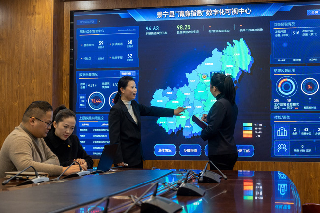 浙江省景宁县纪委监委创新推出“清廉指数”数字化评估与预警平台,定期对各单位“一把手”的廉情动态开展分析评价、综合排名,对存在廉政风险的“一把手”实时预警、“在线吹哨”,形成“监测—评价—预警—整改”的监督闭环。图为该县纪检监察干部借助“清廉指数”数字化评估与预警平台对县管“一把手”开展廉政画像。李肃人 摄