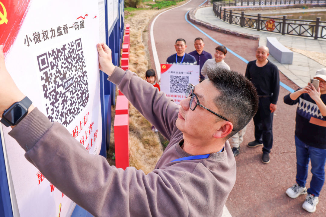 台州市三门县纪委监委把源头治理和日常监督作为工作重点,紧盯“人、财、物、权”等关键环节,推进基层公权力监督体系建设。图为该县纪检监察干部在村内张贴“小微权力监督一码通”。陈昌晖 摄