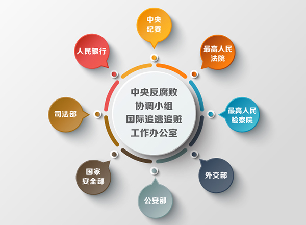 1.2014年6月27日,中央反腐败协调小组设立国际追逃追赃工作办公室,包含中央纪委、最高人民法院、最高人民检察院、外交部、公安部、国家安全部、司法部、人民银行等8家成员单位。中央纪委国际合作局作为办事机构,承担具体工作。