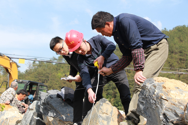 浙江省开化县纪委监委组成调查组,对农村土地整治开发项目土石方工程项目进行测量。(赵远风 摄)