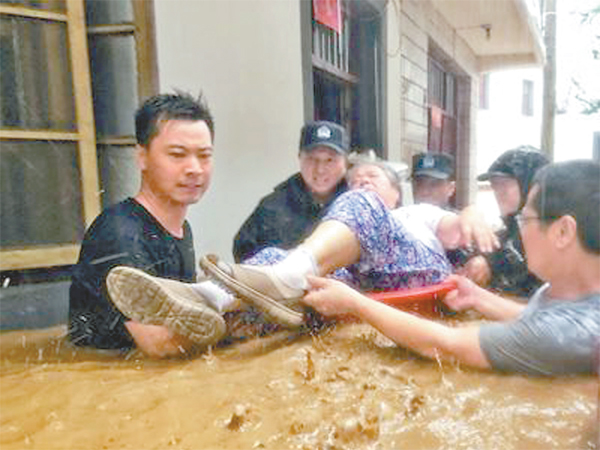 受台风“利奇马”影响,8月10日下午,安徽省宁国市宁墩镇老街受到洪水侵袭,当地村干部和干警正在将一位被困家中的老人转移到安全地带。李晓红 摄