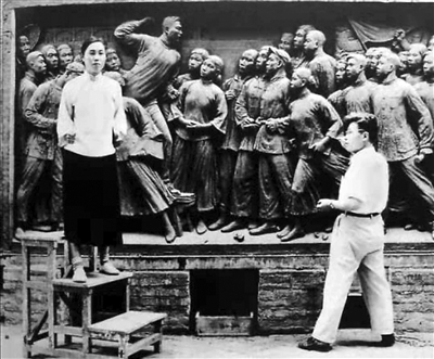 上图:人民英雄纪念碑雕刻家在创作《五四运动》浮雕时,参照模特的形象进行雕刻。