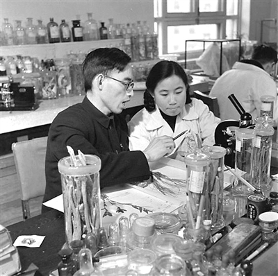 上世纪50年代,在中医研究院中药研究所任研究实习员的屠呦呦(前右)与老师楼之岑一起研究中药。(资料图片)