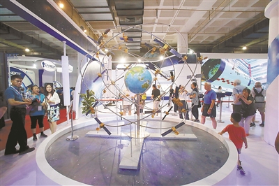 2017年6月9日,参观者在北京科博会上观看北斗导航卫星星座。(资料图片)