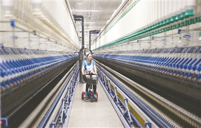 2019年1月11日,工人在山东邹平市魏桥纺织公司智能化车间对生产线进行巡检。魏桥纺织上线了“纺织+AI”人工智能车间,安装了15万个传感器的生产线上,排列整齐的各色设备运转有序,高科技改变了传统生产模式。新华社记者 潘思危 摄