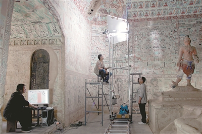 “数字敦煌”利用计算机数字化技术永久且高保真地保存敦煌壁画和彩塑的珍贵资料。30多年来,让一批敦煌艺术精品通过数字平台、数字展览、手机APP等途径走出敦煌。这是敦煌研究院莫高窟第146窟文物数字化保护项目工作现场。(敦煌研究院供图)
