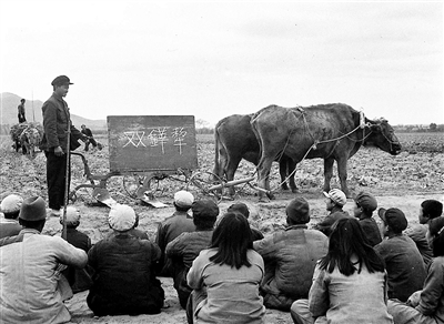 1955年,辽宁省复县沙坨村的扫盲班在地里通过实物进行扫盲教学。新华社发(资料照片)