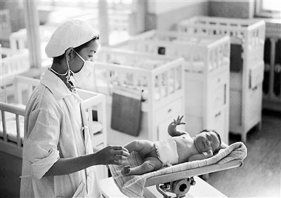 1959年6月北京市妇产医院成立,中国著名的妇产科专家林巧稚任院长。这是1960年2月,护士在宽敞的婴儿室里,给新生的婴儿称体重。新华社发(白瑛 摄)